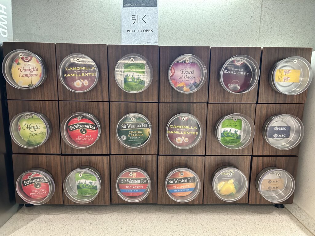 MSCベリッシマのビュッフェは1日約20時間オープンしており、水・コーヒー・紅茶などが自由に飲めます。