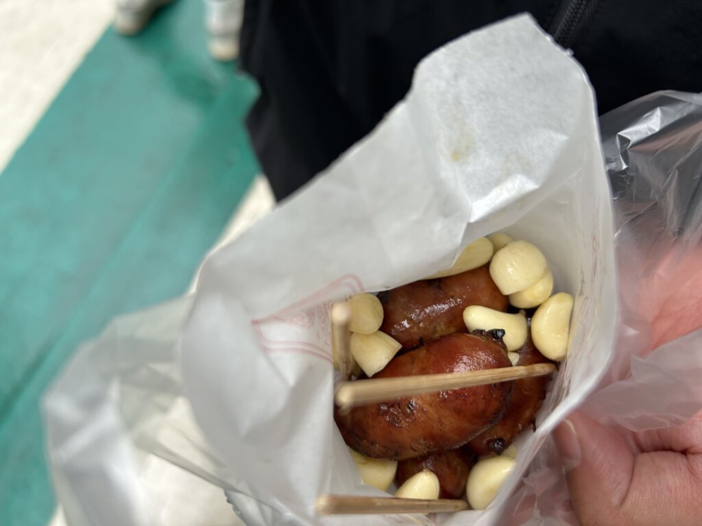 甘みのある台湾ソーセージで、1個単位で購入することができます。その名の通り“一口サイズ”なので、歩きながら食べるのにぴったりでした。