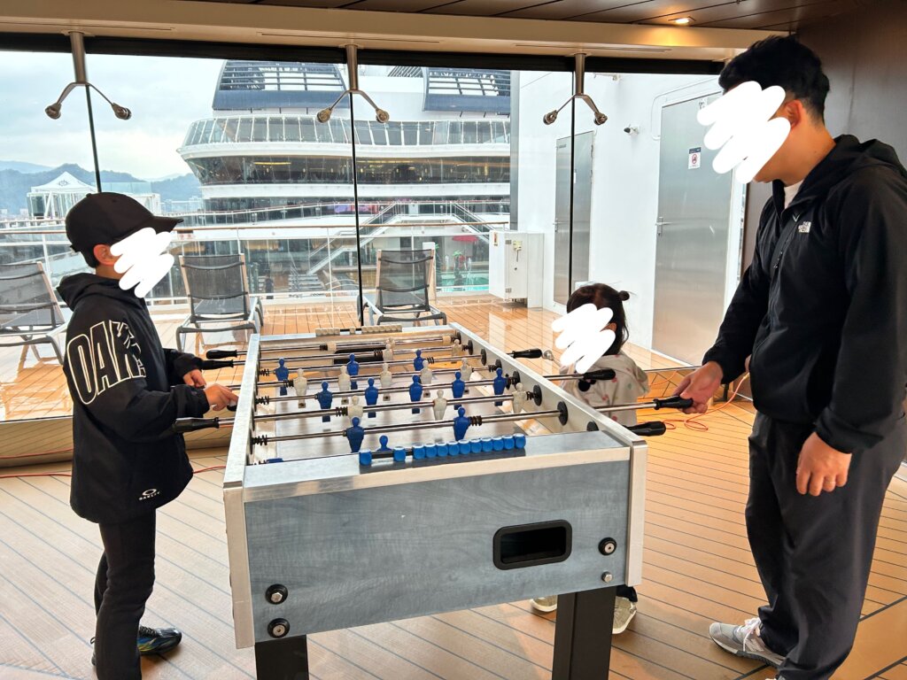 この日の午前中はゆっくりだったので、朝から息子がハマっている卓球とサッカーのボードゲームをしに行くことに。屋内プールのすぐ上に卓球台が2台あるのですが、わが家は乗船中ここに何度も通いました。笑